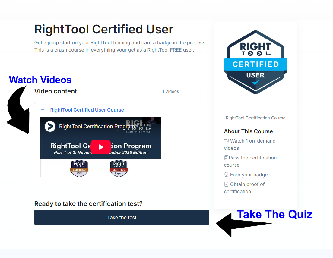Our RightTool "Certified User" Certification course demos all the features included in RightTool FREE. This course is avaliable at no cost for all users
